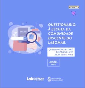 Considerando que a comunicação entre os membros da comunidade do Labomar é um alicerce essencial no planejamento e desenvolvimento de ações para melhorias contínuas no fazer didático-pedagógico, vimos convidá-lo(a) a participar do questionário intitulado À Escuta da Comunidade Discente em Tempos de Pandemia. O questionário objetiva ouvir a comunidade discente do Labomar e suas repostas serão muito importantes no momento de definição do plano de ação desta unidade. Ressaltamos mais uma vez que a participação de todos é imprescindível!